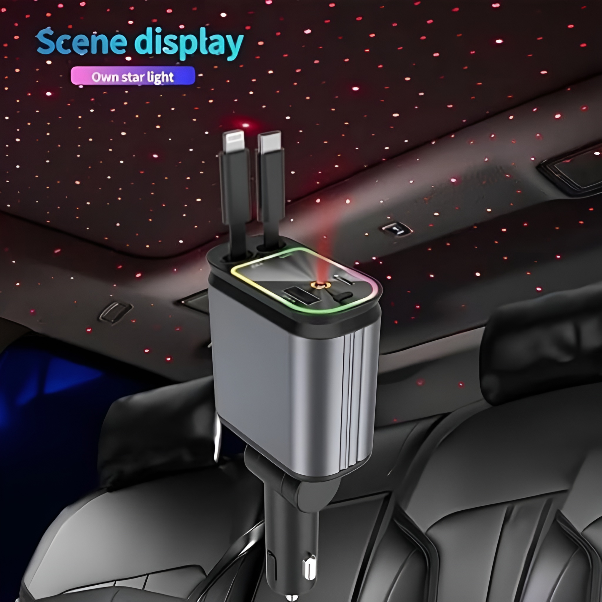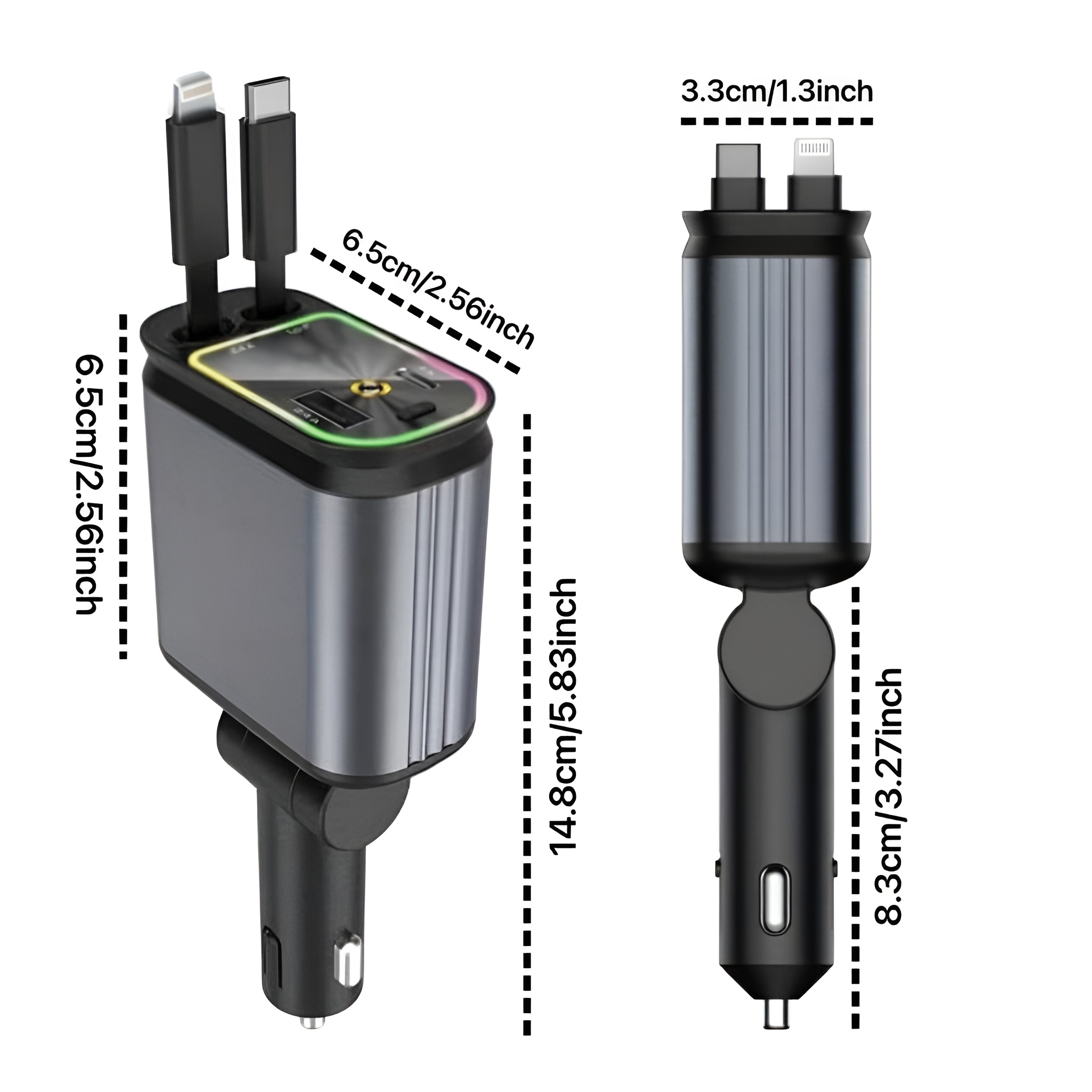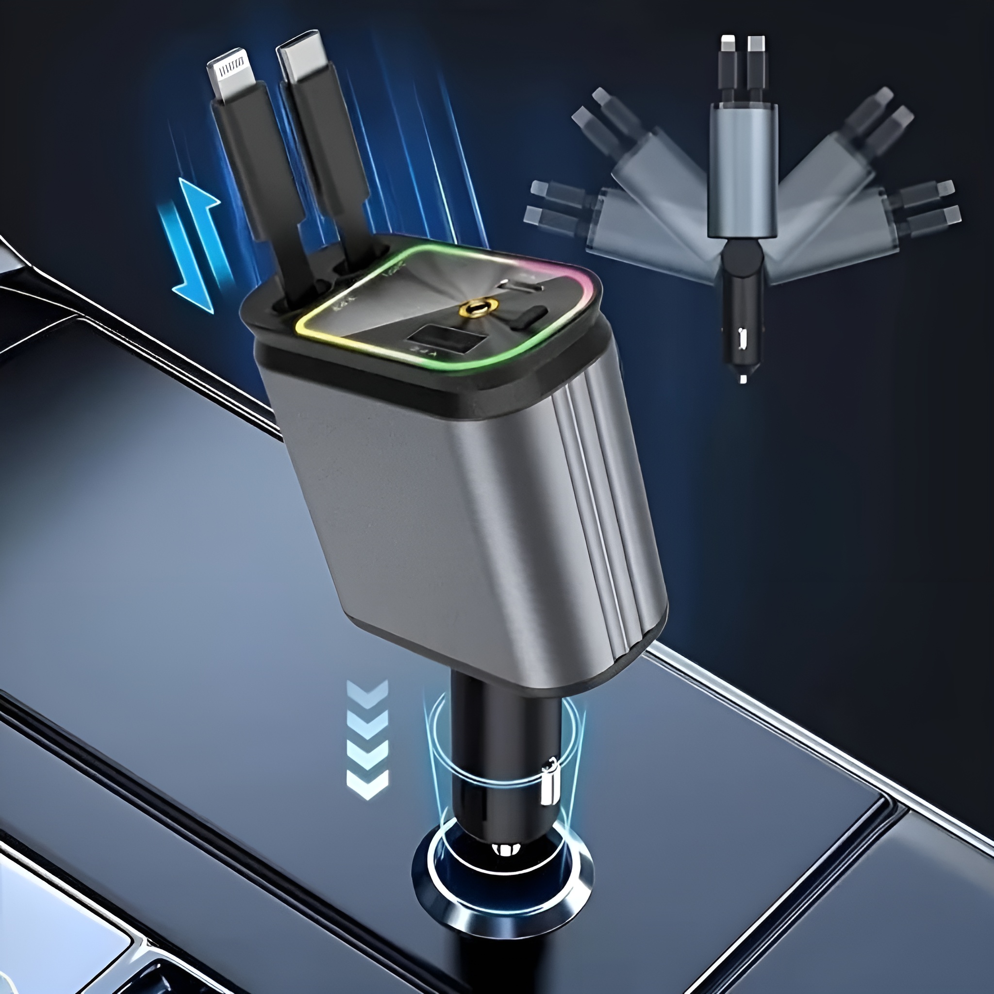 The 4 In 1 Retractable Car Charger With Ambient Light is a dependable accessory for anyone who needs fast and organized charging on the road. The 66W output, adjustable plug, and multi port setup create a complete charging solution for cars. Its retractable cable and ambient light effect contribute to a clean and convenient driving experience. This product combines performance and usability, making it a smart choice for everyday travel and long-distance trips. If you need an efficient and organized method for charging devices in your vehicle, this charger offers the right balance of speed, safety, and convenience.