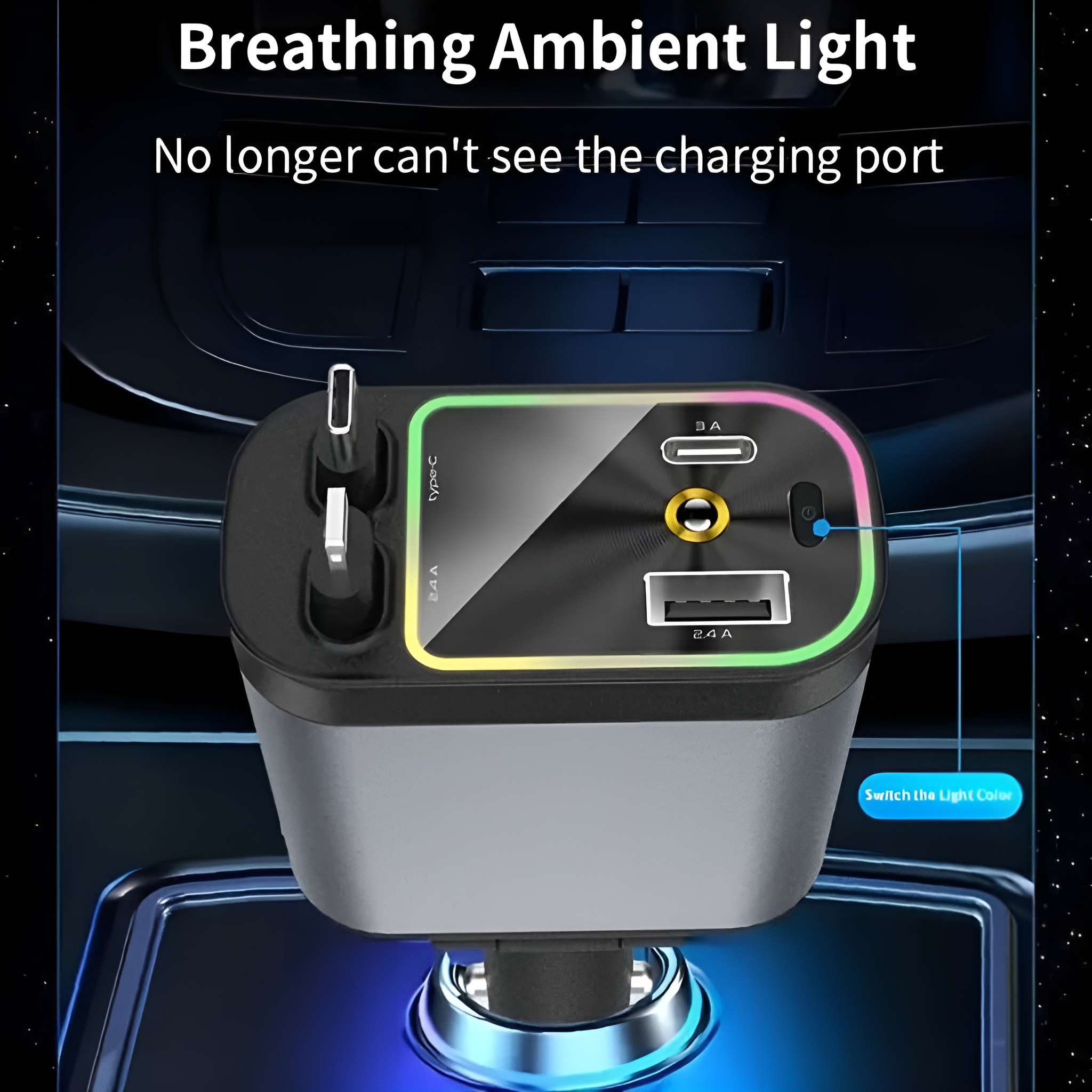 This 4 In 1 Retractable Car Charger With Ambient Light offers more features than traditional car chargers. The combination of fast charging, retractable cable, and ambient lighting improves convenience during travel. Its multi port layout provides power for several devices at the same time. The adjustable plug helps position the charger in tight spaces. The durable structure supports daily use, long road trips, and demanding charging situations.