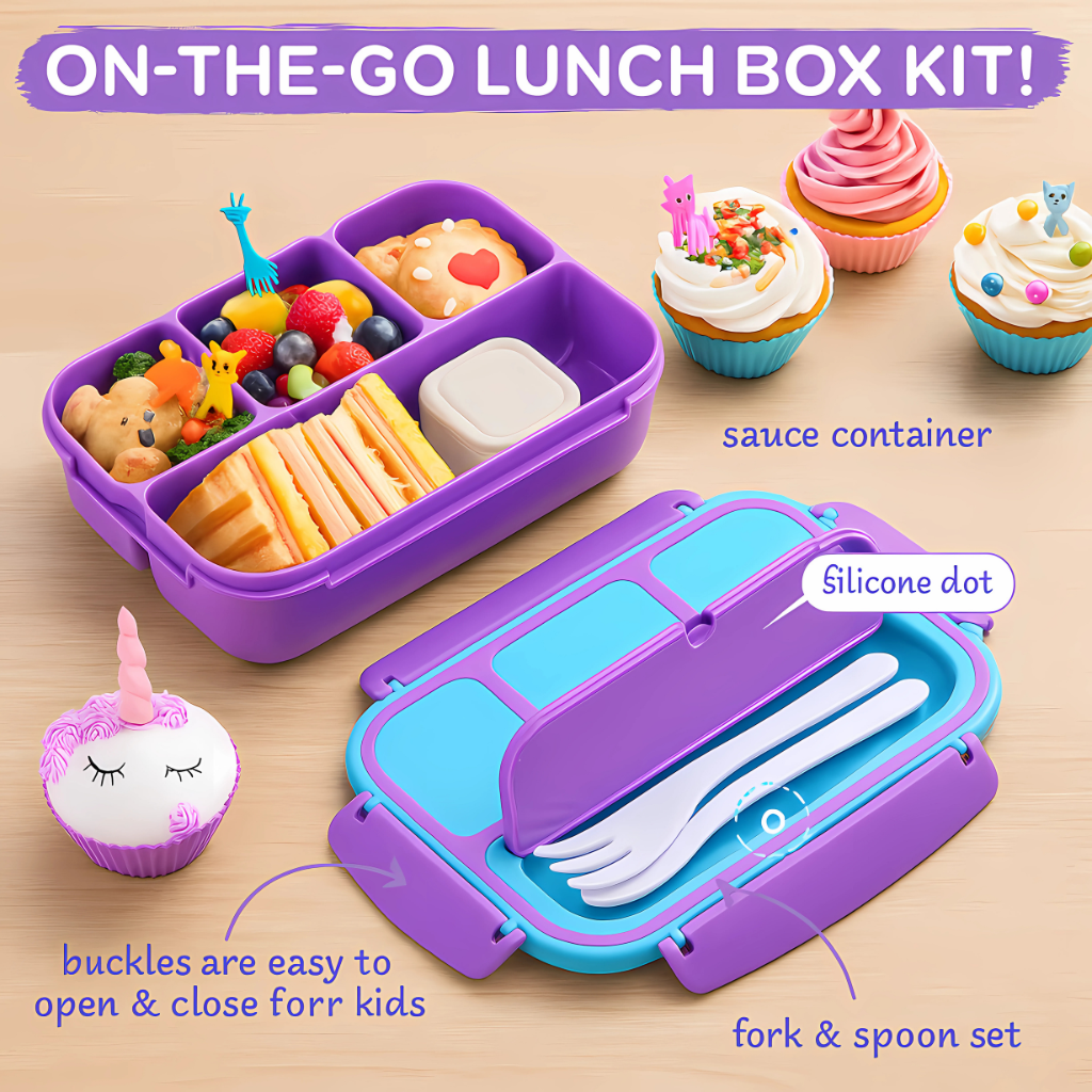 Packing lunches has never been more fun or more efficient than with this Kids Bento Lunch Box. This all-in-one lunch kit is specifically designed to help you pack healthy, mess-no-charge, and visually appealing meals for school, daycare, travel, or even work. Featuring a vibrant purple exterior and kid-friendly design, this bento box brings together utility, safety, and charm—all in a compact 1200ml container.