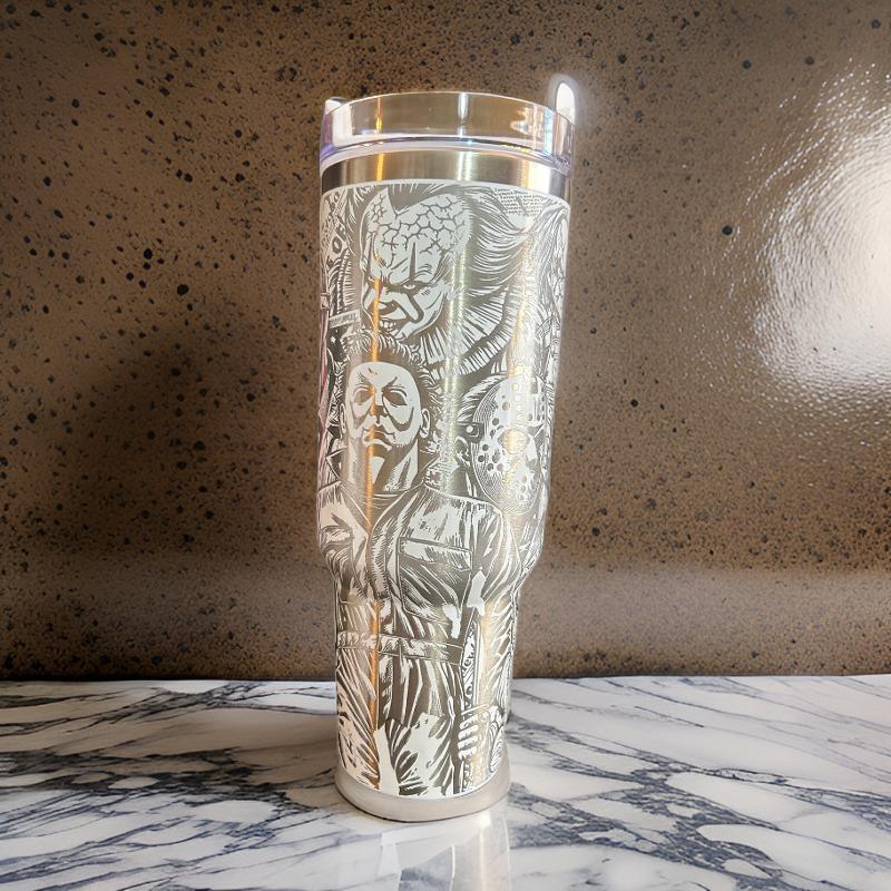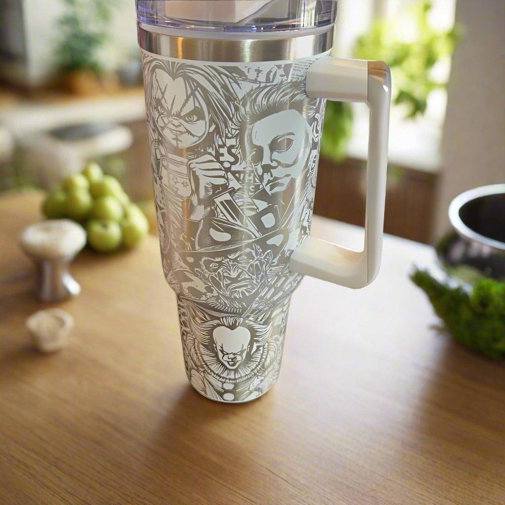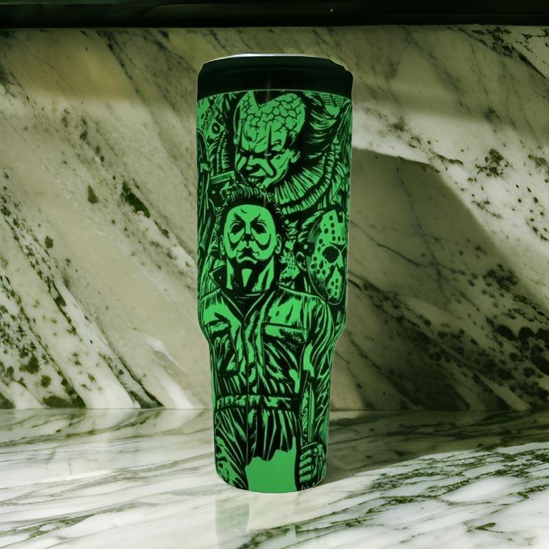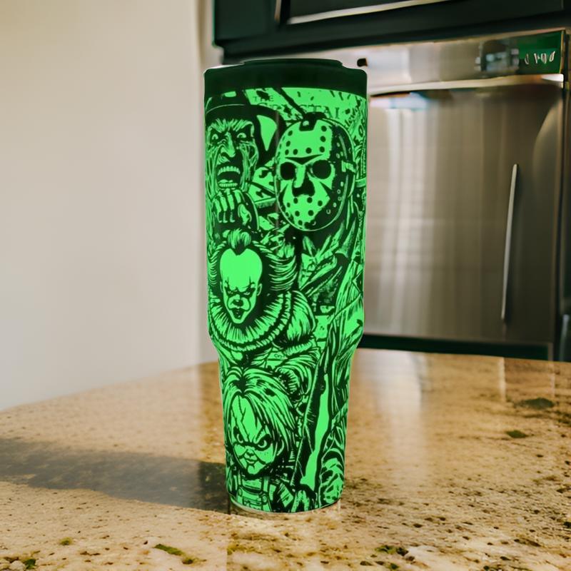 Enjoy a touch to your drinkware collection with this Glow In The Dark Character Printed 40oz Tumbler featuring themed graphics. This tumbler brings eerie vibes to any setting, perfect for fans of classic characters. The glow effect illuminates the designs in the dark, creating a striking and eye-catching look. Designed for both hot and cold beverages, it’s a unique addition for enthusiasts.