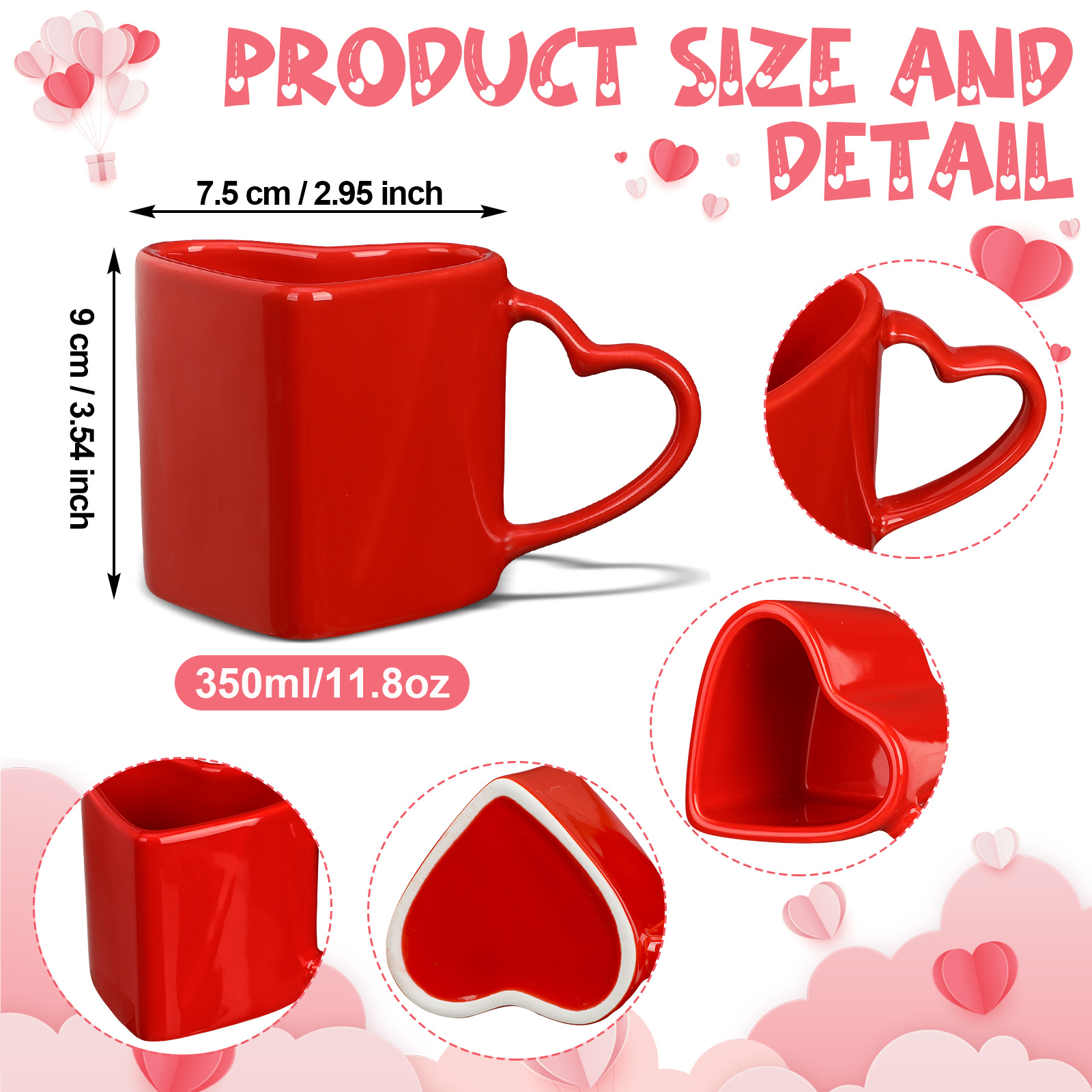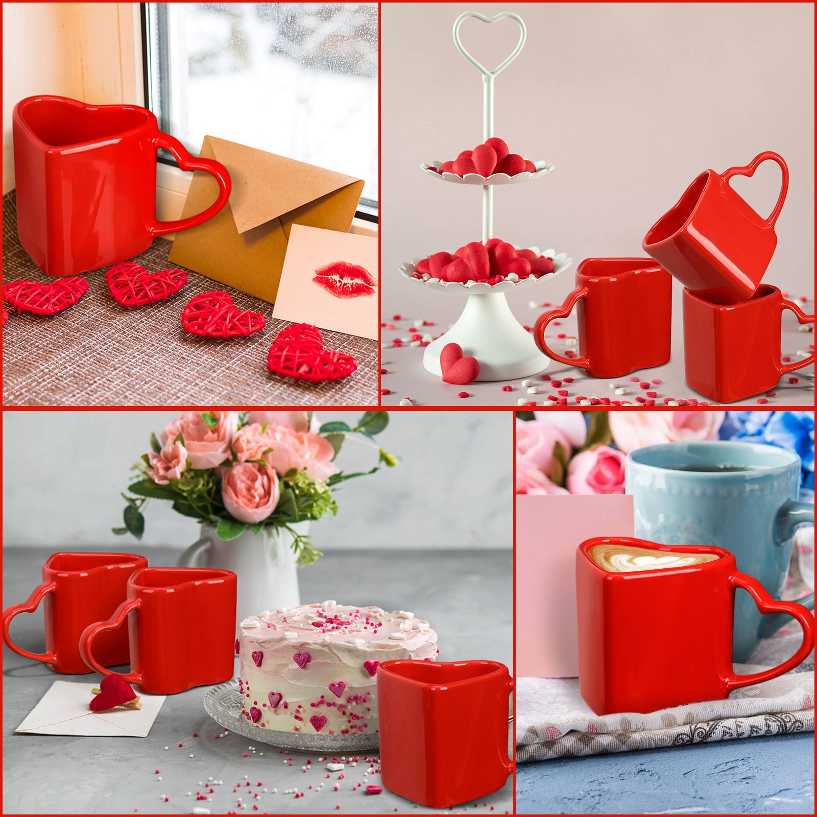Each mug in this set is crafted from ceramic material with a smooth surface finish. The modern design emphasizes clean lines and balanced proportions. The red exterior creates a bold yet refined appearance. The mugs maintain consistent shape and thickness across the set. This supports a uniform look on shelves and tables.